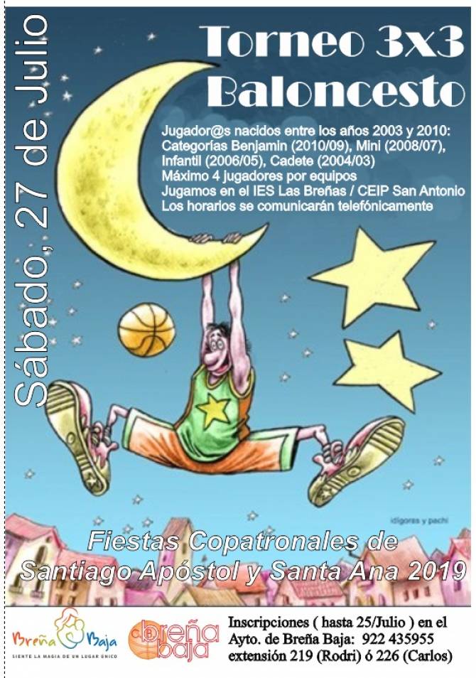 Con motivo de la Fiestas Copatronales de Santiago Apóstol y Santa Ana el Club de Baloncesto de Breña Baja, conjuntamente, con el Ayuntamiento de Breña Baja organizan un Torneo 3x3 de Baloncesto para el sábado 27 de julio en el pabellón del IES “Las Breñas”, tras la buena acogida que tuvo este torneo durante las pasadas Fiesta de San Antonio de Padua.