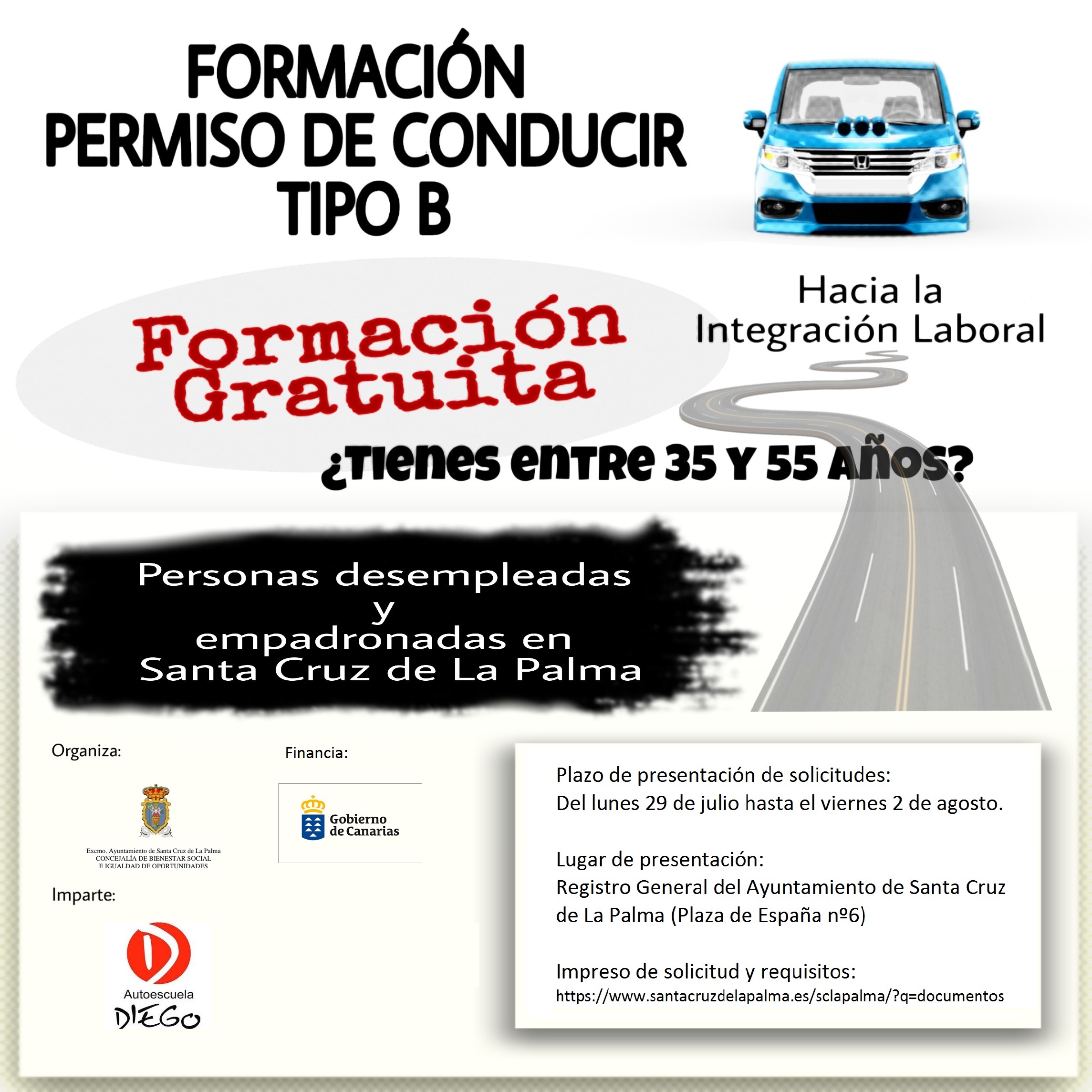 El Ayuntamiento de Santa Cruz de La Palma, a través de la Concejalía de Bienestar Social e Igualdad de Oportunidades, pondrá en marcha una acción formativa para la obtención del permiso de conducir tipo B. El objetivo es posibilitar la integración social y laboral de personas y familias que se encuentran en situación de exclusión social o en riesgo de padecerla.