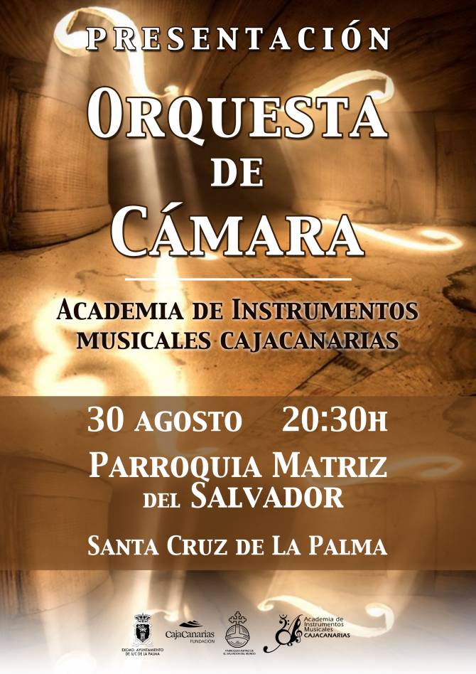 La Asoc. Academia de Instrumentos Musicales CajaCanarias, realizará la presentación de su Orquesta de Cámara el próximo día 30 de Agosto a las 20:30 horas en la Parroquia Matriz del Salvador. Ampliando así su oferta educativa y proponiendo una formación musical novedosa e inexistente en la isla de La Palma. Dicha Orquesta de Cámara se encuentra compuesta por músicos naturales de la isla de La Palma o con vinculación con la misma; (alumnos/as que realizan sus estudios musicales superiores fuera de la isla o concluidos, alumnos/as pertenecientes a éste centro musical), buscando el deseo de que éste proyecto tenga duración en el tiempo para que el mismo pueda proyectar su parte pedagógica y educativa.