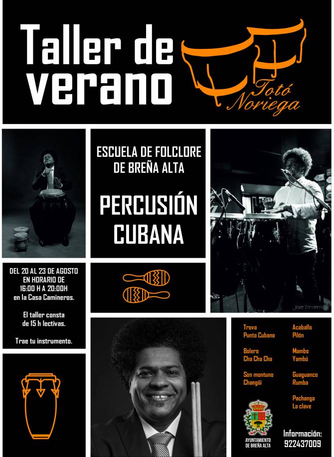 El Ayuntamiento de Breña Alta, en colaboración con la Escuela de Folclore Municipal pone en marcha el Taller de Percusión cubana, de la mano del reconocido percusionista Gilberto ‘Totó’ Noriega, natural de San Antonio de los Baños, en Cuba, aunque afincado desde hace años en Gran Canaria.