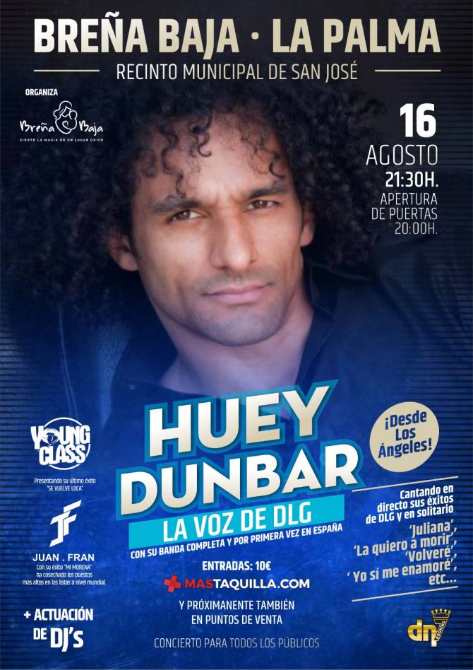 El viernes 16 de agosto a las 21.30 hs en el Recinto Municipal de San José el Ayuntamiento de Breña Baja presenta a Huey Dunbar y su banda, en un espectáculo de lo mas exquisito para los amantes de la música latina. Produce DNavarro 7 events.