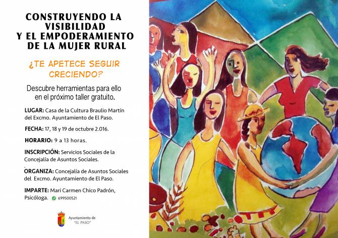 La Casa de la Cultura Braulio Martín de El Paso acoge del 17 al 19 de octubre un taller de doce horas de duración, con horario de 9:00 a 13:00 horas, y dirigido especialmente a mujeres rurales con especiales dificultades de inserción, por su escasa formación y especialización, así como por el escaso conocimiento y manejo de las Nuevas Tecnologías.