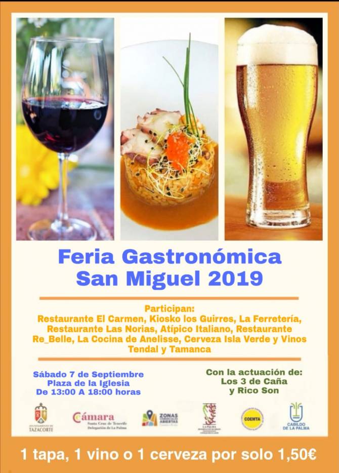 Tazacorte acoge este sábado, día 07 de septiembre, de 13:00 a 18:00 horas en la Plaza de España, en el marco de las Fiestas Patronales de San Miguel Arcángel, el VIII Encuentro Enogastronómico, edición especial “San Miguel 2019”, una feria puesta en marcha por el área de Desarrollo Local de Ayuntamiento de Tazacorte con la colaboración de Coemta “La Asociación de Empresarios de Tazacorte”, el Consejo Regulador de la Denominación de Origen Vinos de La Palma, Cabildo de la Palma, Gobierno de Canarias y Zonas Comerciales Abiertas, se informa en nota de prensa.