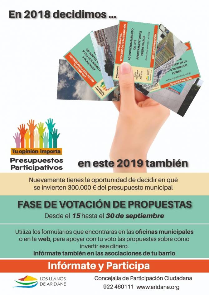 El Ayuntamiento de Los Llanos de Aridane convoca a los aridanenses a participar en la fase de votación de las 53 propuestas consideradas viables que han sido presentadas por las asociaciones de vecinos y particulares para ser incorporadas a los presupuestos participativos de 2020, a los que la corporación municipal destinará para el próximo año un total de 300.000 euros. El período de votación comienza este viernes 15 y finalizará el próximo 30 de septiembre, ambos inclusive.