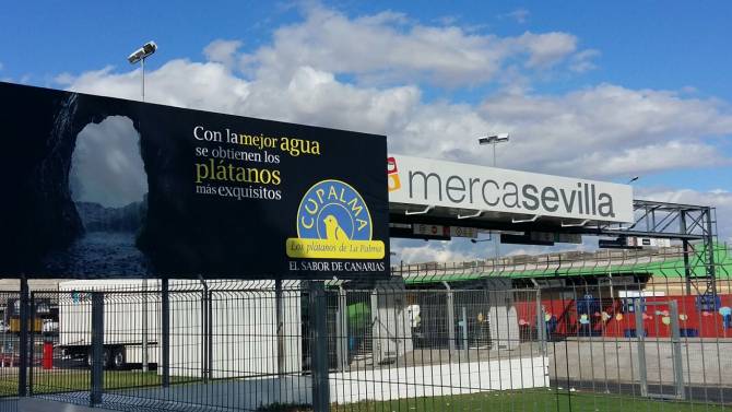 Si usted visita el mayor centro de distribución de frutas y verduras del sur de la Península se encontrará con una imagen única de los Nacientes de Marcos y Corderos y una invitación a consumir plátanos de la isla de La Palma.