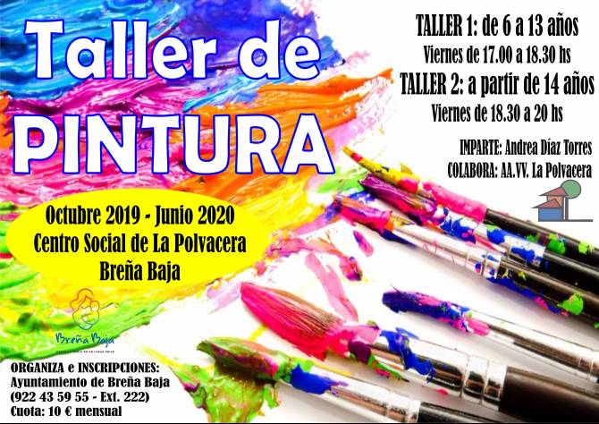 La Concejalía de Cultura, Educación, Artesanía, Participación Ciudadana y Patrimonio del Ayuntamiento de Breña Baja organiza un “Taller de Pintura” para todas las edades (de 6 años en adelante), para los meses de octubre a junio en el Centro Social de La Polvacera. Imparte Andrea Díaz Torres y colabora la asociación de vecinos de La Polvacera.