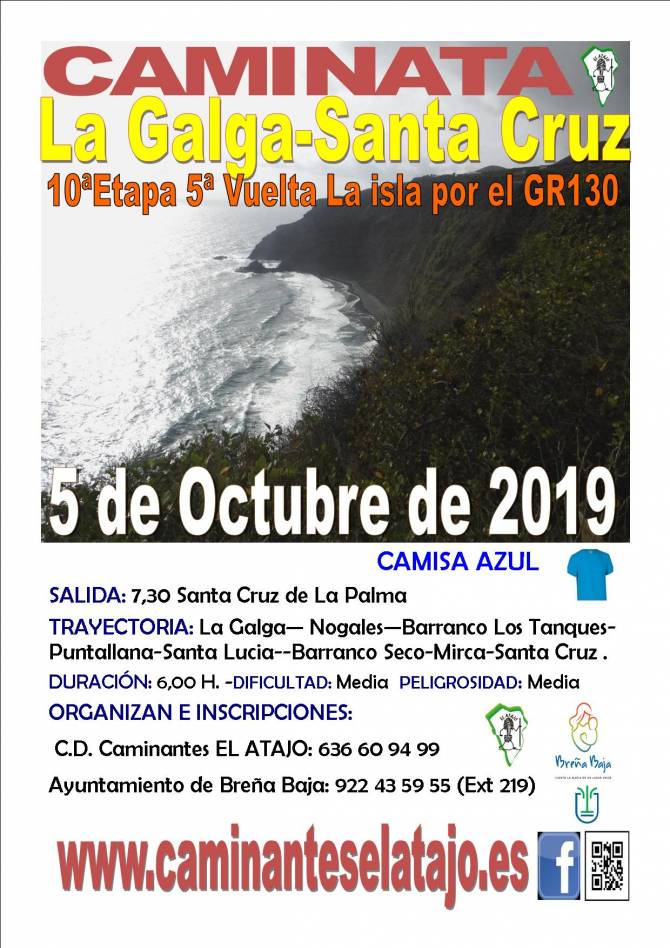 Este sábado 5 de octubre, el C. D. de Caminantes "El Atajo" y el Ayuntamiento de Breña Baja organizan, dentro del Programa de Senderismo de Breña Baja, la caminata nº 634: "La Galga (Puntallana) - Santa Cruz de La Palma".