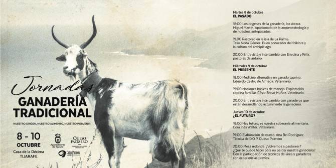 El Ayuntamiento de Tijarafe, a través de su concejalía de Ganadería, y en colaboración con la Asociación de Criadores de Cabra de Raza Palmera y el Consejo Regulador de la Denominación de Origen Protegida Queso Palmero, organiza las Primeras Jornadas de Ganadería Tradicional, que se desarrollarán del 8 al 10 de octubre. Esta iniciativa, que lleva por título “Ganadería tradicional: nuestro origen, nuestro alimento, nuestro porvenir”, tratará a lo largo de tres días el pasado, presente y futuro de este sector.