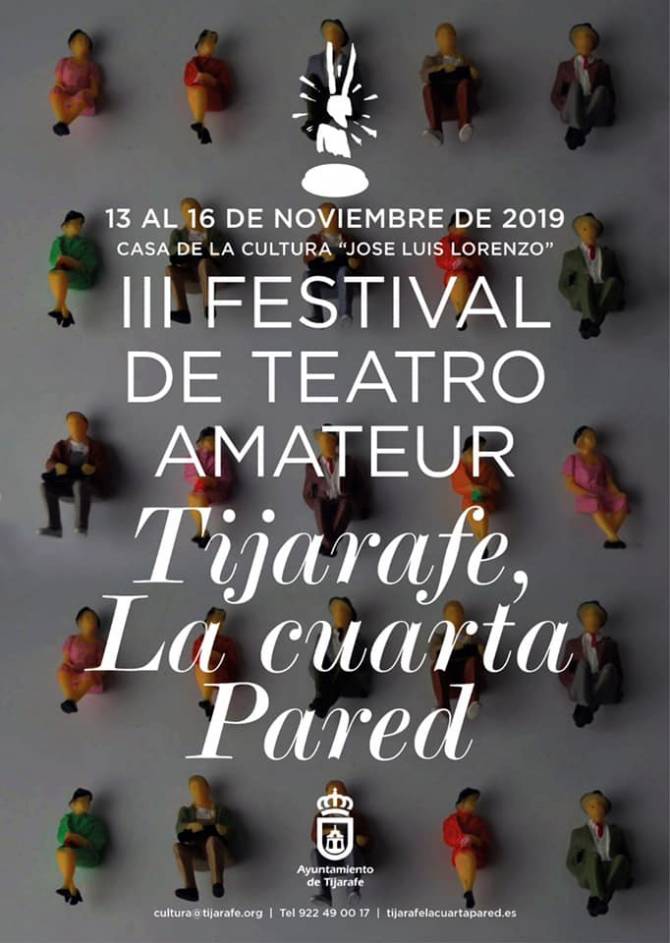 Por tercer año consecutivo se celebra en el municipio de Tijarafe el festival de teatro amateur, pionero en la Isla de La Palma: “Tijarafe, La Cuarta Pared”. Vuelve cargado de nuevas puestas en escena, así como de otras iniciativas que se han valorado desde la organización para que este año el festival siga creciendo. Ya en sus comienzos, aspiraba a convertirse en un referente del mundo escénico en Canarias, y no sólo ha conseguido mantenerse cada año, sino seguir atrayendo a multitud de artistas al municipio tijarafero consiguiendo, con ello, que Tijarafe sea uno de los puntos de encuentro más nombrados del archipiélago dentro de este campo.