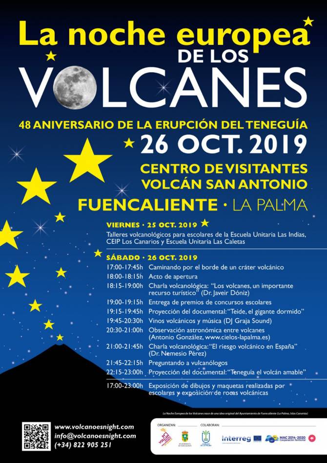 El municipio de Fuencaliente de La Palma será sede el próximo 26 de octubre de la celebración de la Noche Europea de los Volcanes, un acto organizado por el Ayuntamiento del municipio en colaboración con el Instituto Volcanológico de Canarias (INVOLCAN), y en el seno de la cual se conmemorará el 48 aniversario de la erupción del Teneguía (1971), la última erupción histórica en tierra de Canarias.