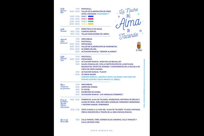 ntre las novedades de esta edición, la Casa de la Cultura acogerá a las 18:30h la Charla Coloquio ‘El Alma de Tacande y los Efectos Paranormales’ con las ponencias de Antonio Manuel Fernández, Fernando Hernández y José Gregorio González, bajo el título “Alma de Tacande, aparecidos, historias de brujas y almas en pena”. A continuación, se realizará una Visita Guiada a la Casa del Alma de Tacande, una actividad con plazas limitadas y previa inscripción a través de la web www.elpaso.es
