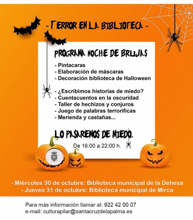 Las bibliotecas de Mirca y La Dehesa celebrarán los días 30 (La Dehesa) y 31 (Mirca) una noche de brujas que comenzará a las 16:00 y finalizará a las 22:00 horas. En las actividades podrán participar niñas y niños entre los 4 y los 14 años y pueden llegar a las actividades disfrazados.