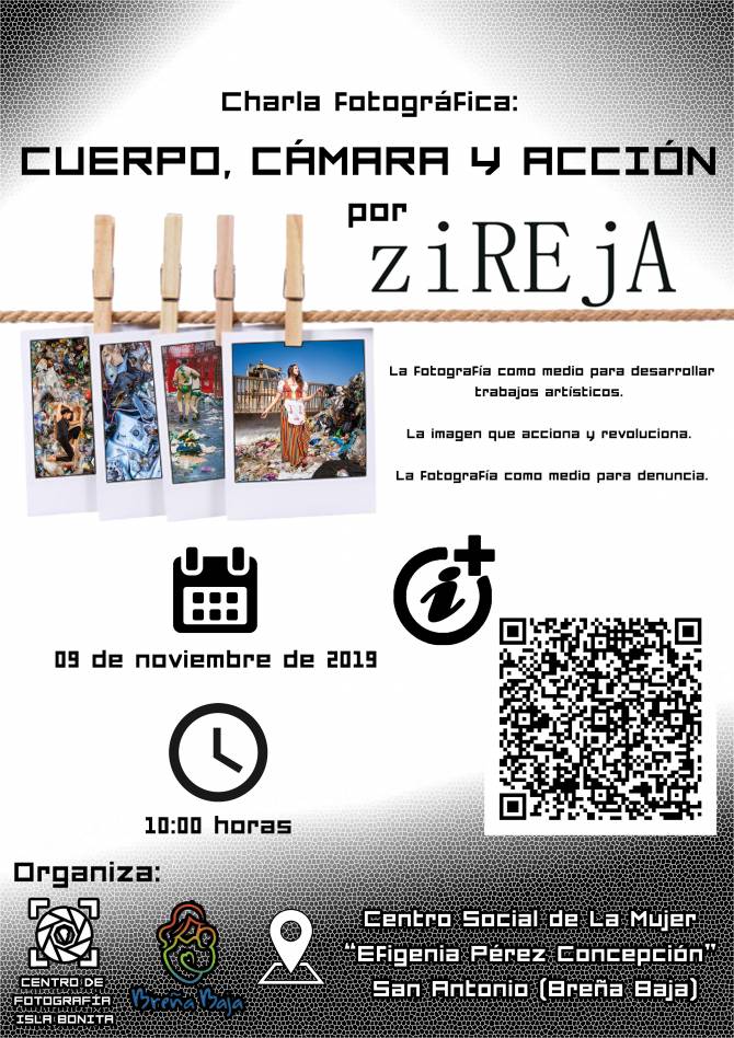 El Centro de Fotografía Isla Bonita, con el apoyo de la Concejalía de Cultura, Educación, Artesanía y Participación Ciudadana del Ayuntamiento de Breña Baja, han organizado para este sábado 9 de noviembre a las 10 hs en el Centro Social de La Mujer “Efigenia Pérez Concepción” de San Antonio la charla fotográfica “Cuerpo, Cámara y Acción” impartida por Irene Sanfiel “ziREja”.