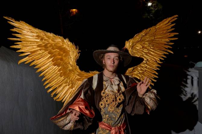Uno de estos trajes es el denominado Demonio, realizado en piel de cabra por el artesano palmero Rober Animal, con zancos y máscara tallada en madera y que incorpora cuernos de vaca y piel elaborados en Alemania. El segundo de los trajes es el relativo a un Ángel Arcabucero, al estilo de los ángeles barrocos del Perú, realizado por Verónica Jimeno y que se complementa con unas alas doradas fabricadas en los Estados Unidos y una espada dieciochesca. Estos dos trajes, valorados en unos 3.000 euros, formaron parte de los espectáculos creados por Cavallé Cruz, Imawaden y Las tentaciones de don Antonio de Orbarán, estrenados respectivamente en las fiestas de arte de Tijarafe de 2018 y 2019.