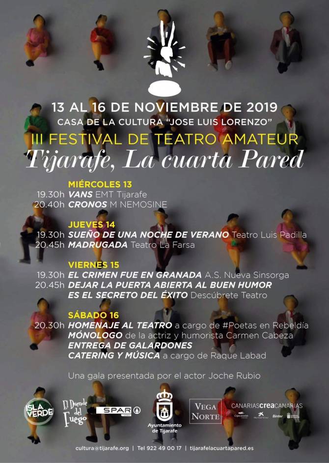 La cita con el teatro amateur regresa esta semana a Tijarafe con la celebración de la tercera edición del Festival de Teatro “Tijarafe, La Cuarta Pared”. Del 13 al 16 de noviembre, un total de 6 grupos de teatro, provenientes de diferentes puntos del archipiélago, se subirán al escenario de la Casa de la Cultura “José Luis Lorenzo Barrero”. Lo que permitirá disfrutar una semana de escenificaciones de todos los géneros teatrales.