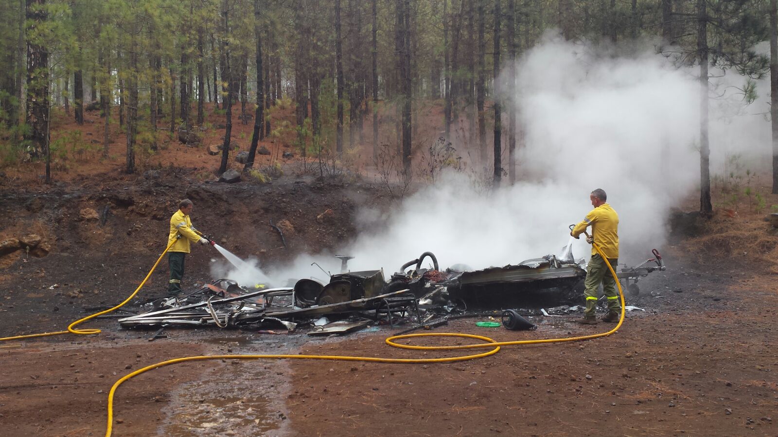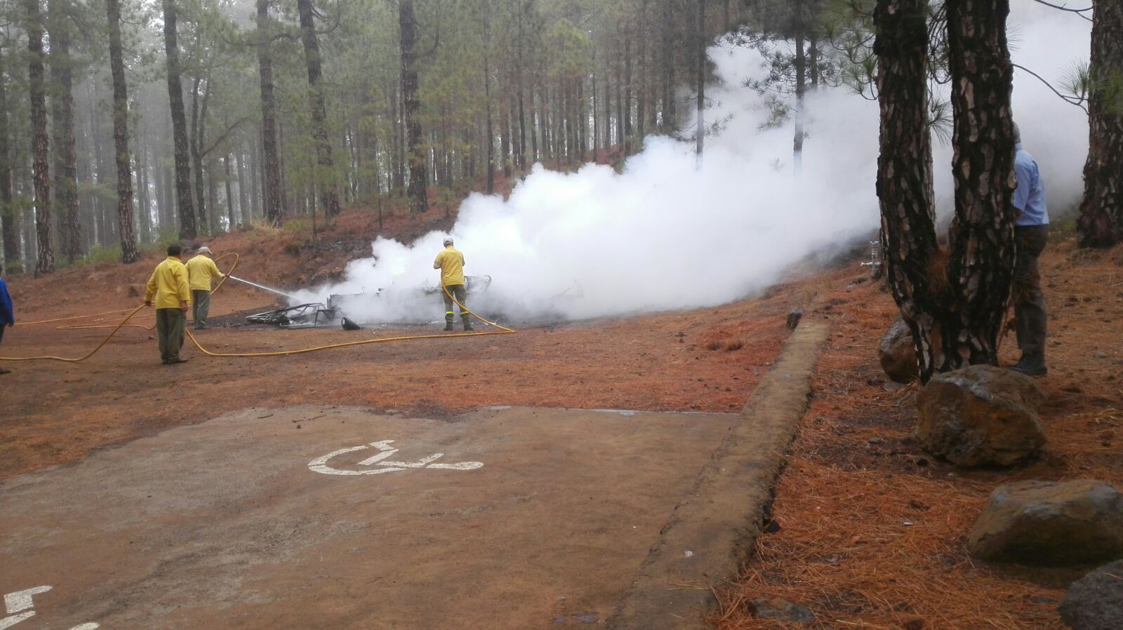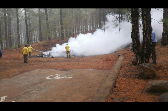 medio dia de hoy, un fuego que se inició en una caravana estacionada en el área recreativa de Tinizara, Tijarafe, provocó un conato de incendio forestal.