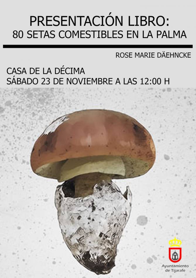 Saray Domínguez, concejala de Agricultura del Ayuntamiento de Tijarafe, señala “agradecemos a Marie Dähncke su predisposición para presentar su libro, fruto de más de tres décadas de estudio de los hongos en la isla de La Palma, y, además, hacerlo dentro de la programación de la Semana Cultural de Tijarafe”. Marcos Lorenzo, alcalde del municipio, por su parte, añade“este sábado Tijarafe contará con una amplia programación cultural, que comenzará por la mañana con actividades para los más jóvenes, continuará con la presentación de “80 setas comestibles en La Palma”, una interesante publicación que nos acerca al mundo de la micología, hasta llegar a la presentación del nuevo espectáculo de “Gratén Palm, paisajes sonoros”. Actividades para todos y todas, sea cual sea la edad, a las que animo a asistir”.