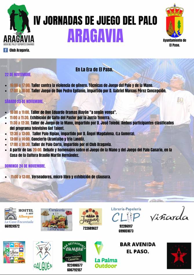 La jornada se amenizará posteriormente con el trío de música afroperuana ‘Landó’ y el rapero palmero ‘Aranfaibo’. Por la tarde, ese mismo día, el Club Aragavia impartirá un taller de Juego del Palo Corto, estilo que lleva cinco años rescatándose en el municipio por parte del maestro Carlos Molina. Ya por la noche se celebrarán diferentes charlas, debates y homenajes en la Casa de la Cultura. Finalmente, el domingo se procederá a la clausura con unas demostraciones libres, música, poetas y el buen ambiente que caracteriza a nuestras tradiciones.