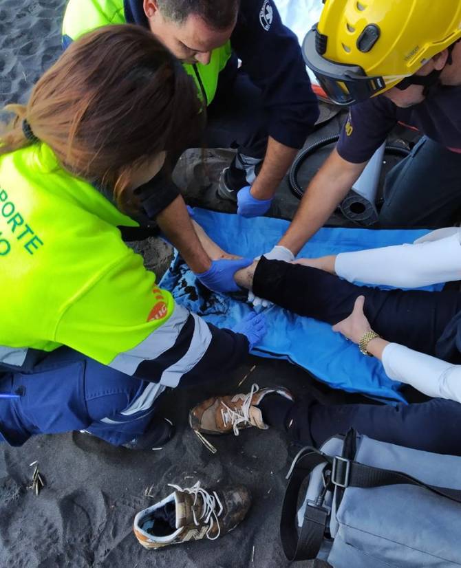 Los bomberos socorren a una bañista herida en la playa de Nogales