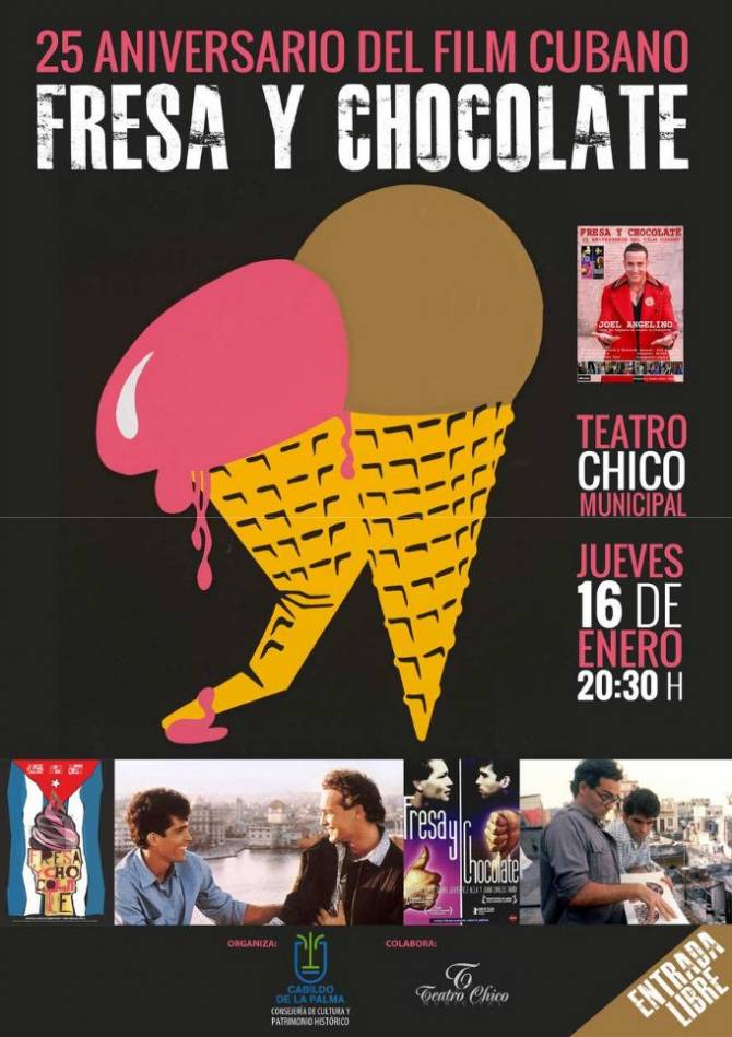 El Cabildo de La Palma, a través de la Consejería de Cultura, ha programado la representación de la obra teatral Fresa y chocolate basada en la película del mismo título. La función se lleva a las tablas con motivo del 25 aniversario de esta famosa producción cinematográfica cubana de 1993. La cita con esta propuesta escénica tendrá lugar en el Cine Teatro Chico de Santa Cruz de La Palma este jueves, 16 de enero, a las 20:30 horas. El pase es libre y gratuito hasta completar aforo.