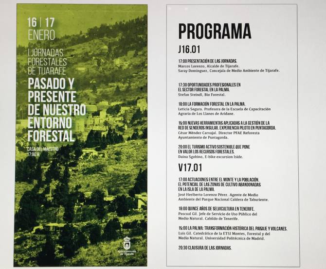 El viernes 17 de enero, a partir de las 17:00 horas, el último día de estas jornadas finalizará con la charla “Actuaciones entre el monte y la población. El potencial de las zonas de cultivo abandonadas en la isla de La Palma”, impartida por José Heriberto Lorenzo Pérez, agente de Medio Ambiente del Parque Nacional de la Caldera de Taburiente. Para continuar con “Quince años de silvicultura en Tenerife”, por Pascual Gil, jefe de servicio de Uso Público del MedioNatural del Cabildo de Tenerife. Concluyendo con “La Palma: transformación histórica del paisaje y volcanes”, a cargo de Luis Gil, catedrático de la ETSE Montes, Forestal y del Medio Natural, de la Universidad Politécnica de Madrid.