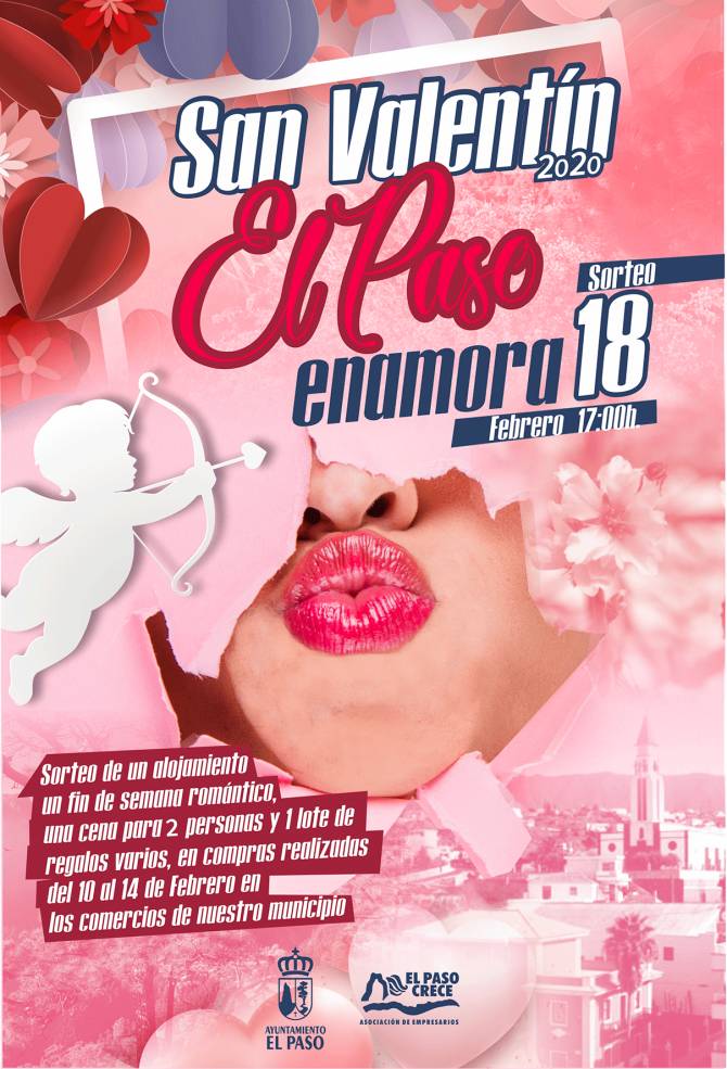 El Ayuntamiento de El Paso, con el respaldo de la Asociación de Empresarios El Paso Crece, presenta la campaña comercial ‘El Paso Enamora’ con motivo de la celebración de San Valentín 2020. Los establecimientos adheridos a esta nueva iniciativa de dinamización, repartirán entre sus clientes una serie de tickets, por compras realizadas entre el 10 y el 14 de febrero, con los que podrán participar en el sorteo de un fin de semana romántico en el municipio.