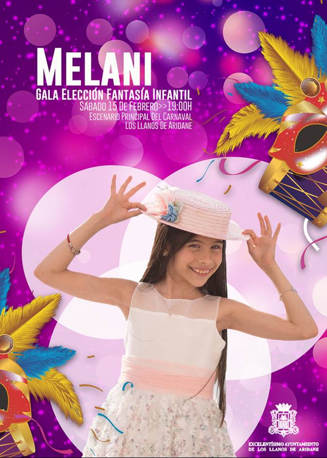 La gala, que contará con la participación de los diferentes grupos que conforman el carnaval aridanense, comenzará a las 19 horas con las actuaciones de con las comparsas infantiles y personajes sorpresas que amenizarán la tarde en que Los Llanos de Aridane elegirá a su mejor fantasía infantil. La velada contará con la actuación de la artista invitada Melani García Gaspar, ganadora de la cuarta temporada de La Voz Kids y representante española del Festival de Eurovisión Junior 2019 celebrado en Polonia donde ocupó la tercera posición.