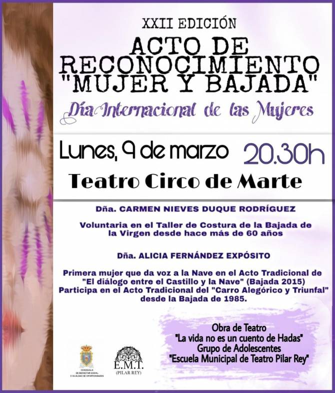 El Ayuntamiento de Santa Cruz de La Palma, a través de la Concejalía de Bienestar Social e Igualdad, entregará el próximo día 9 de marzo el reconocimiento como Mujer Destacada del Municipio a Carmen Nieves Duque y Alicia Fernández Expósito por su labor en la Bajada de la Virgen. El acto tendrá en el Teatro Circo de Marte, a partir de las 20.30 horas.