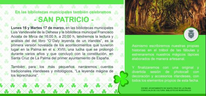 Las bibliotecas municipales Luis Vandevalle de La Dehesa y Francisco Acosta de Mirca celebrarán los días 16 y 17 de este mes la fiesta de San Patricio. Ambos centros han organizado una lectura y análisis del libro ‘O’Daly, leyenda de un irlandés’, la primera versión novelada de los acontecimientos que tuvieron lugar en La Palma en el siglo XVIII, una lucha que se prolongó durante varios años y que concluyó con la constitución del primer ayuntamiento de España en Santa Cruz de La Palma.