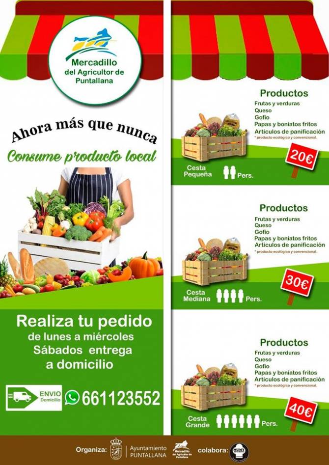 El Mercadillo de Puntallana abre sus puertas de 9,00 h a 12,00h todos los sábados mientras dure el estado de alarma, ofreciendo productos alimentarios tal y como establece el RD 463/2020, de primera necesidad como son fruta y verdura tanto ecológica como convencional, quesos acogidos a la DOP, Queso Palmero y otras variedades de quesos del municipio, productos de panadería y pastelería de elaboración artesanal del municipio. Cada sábado todos los productores llevan al mercadillo lo mejor de todo su trabajo durante toda la semana, además se cumple estrictamente el protocolo en materia sanitaria para paliar la crisis del COVID-19, tanto por los vendedores, como seguridad para los compradores guardando distancias de seguridad, controlando el aforo y suministrando las medidas higiénicas suficientes.