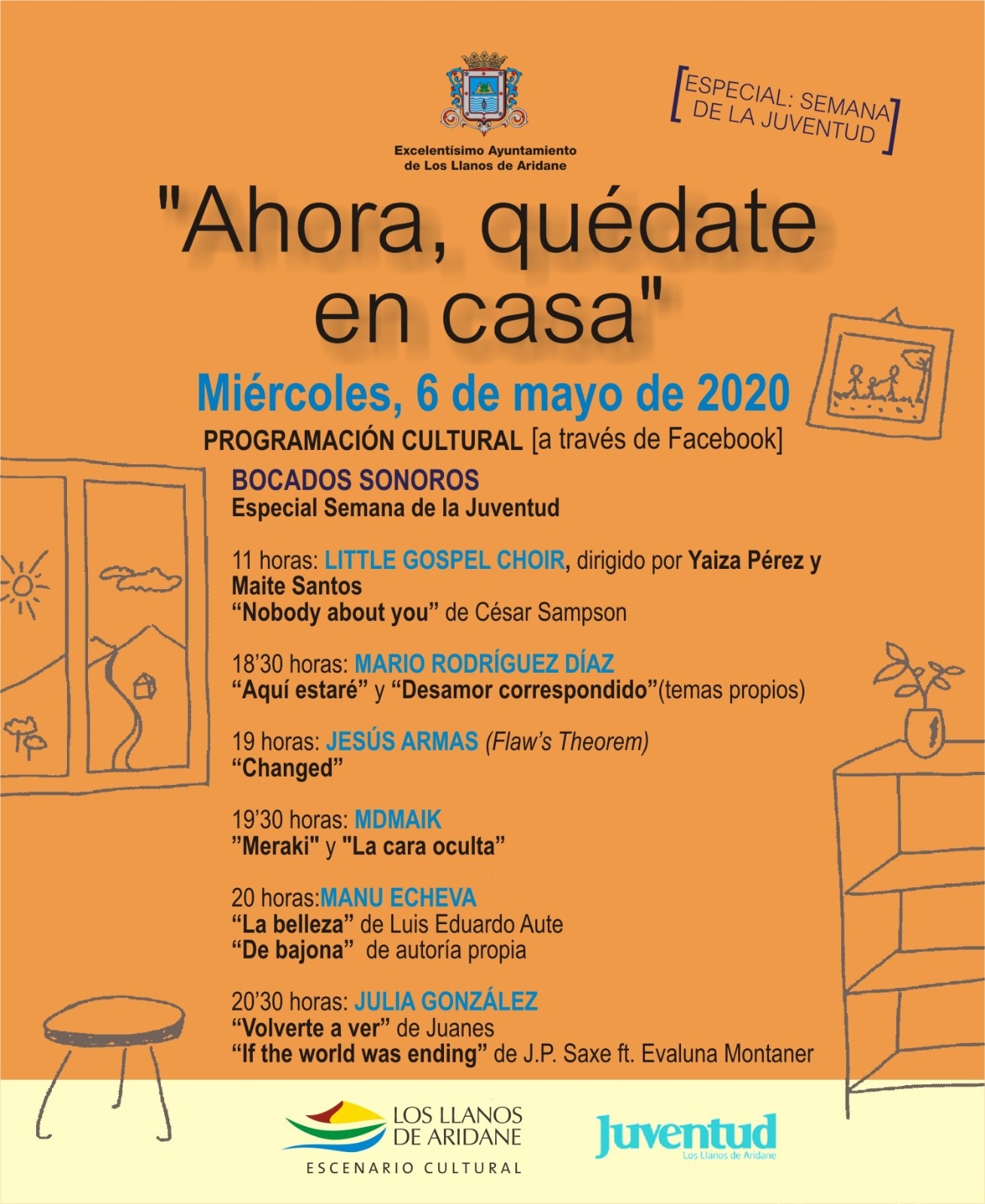 Dentro de la propuesta semanal #AhoraQuédateEnCasa la programación cultural plantea para mañana miércoles 6 una serie de actuaciones donde los protagonistas serán los artistas jóvenes del Valle de Aridane. A las 11 horas, y a través del Facebook de Cultura dará comienzo el Bocados Sonoros con la actuación de las voces de “Little Gospel Choir” dirigido por Yaiza Pérez y Maite Santos que interpretarán “Nobody about you” de César Sampson.