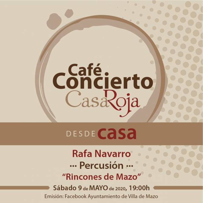 El Ayuntamiento de Villa de Mazo apuesta por continuar difundiendo la cultura y la música en el municipio a través de las redes sociales gracias al ciclo Café-Concierto desde Casa. El percusionista Rafa Navarro ofrecerá un concierto el próximo 9 de mayo, a las 19:00 horas, en directo a través de la página oficial de Facebook del Ayuntamiento de Villa de Mazo https://www.facebook.com/Ayuntamiento-de-Villa-de-Mazo