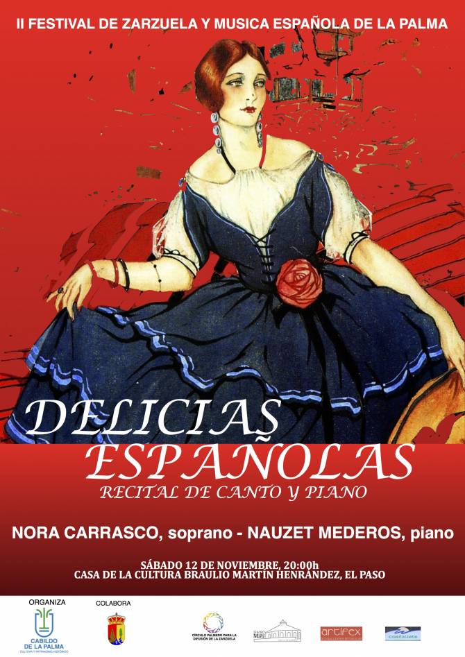 El recital de canto y piano Delicias Españolas que pone fin al ciclo se pondrá en escena este sábado, 12 de noviembre, a las 20:00 horas en la Casa de la Cultura de El Paso con las interpretaciones de Nora Carrasco (soprano) y Nauzet Mederos (piano).