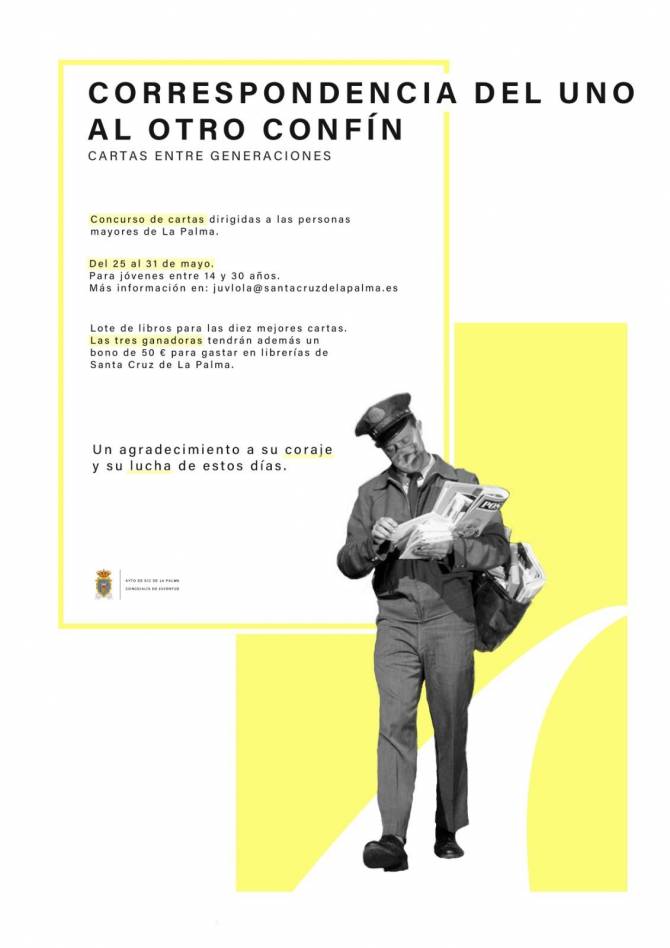 El concurso se denomina “Correspondencia del uno al otro confín. Cartas entre jóvenes y mayores”, y está orientado a jóvenes de entre 14 y 30 años de edad (cumplidos durante el año en curso) residentes en La Palma. Se invita a la gente joven a escribir una misiva a las personas que han vivido y viven la pandemia en los centros de mayores.