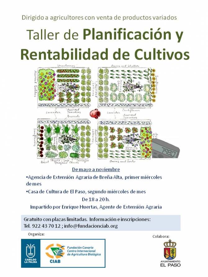 La Fundación Centro Internacional de Agricultura Biológica, CIAB, y el Cabildo de La Palma, a través del Servicio de Agricultura, Ganadería y Pesca y en colaboración con el Ayuntamiento de El Paso pondrá en marcha a partir del próximo 4 de mayo un taller de planificación y rentabilidad de cultivos.