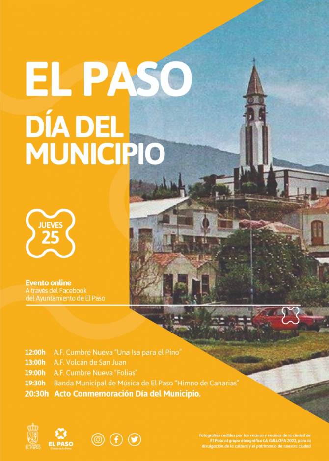 Los actos conmemorativos de esta festividad arrancarán muy temprano con la Izada de la bandera municipal en la Plaza Pedro Capote Gutiérrez, posteriormente a las 12:00 horas podremos disfrutar de la actuación de la Agrupación Folclórica Cumbre Nueva interpretando “Una isa para El Paso”. Posteriormente, a las 13:00 horas, será el turno para la Agrupación Volcán de San Juan. En horario de tarde a las 19:00 horas, folias por la A.F. Cumbre Nueva y a las 19:30 horas la Banda Municipal de música de El Paso interpretará el Himno de Canarias. Este emotivo Día se cerrará con el acto conmemorativo desde la Iglesia de Bonanza a las 20:30 horas y la posterior arriada de la bandera del municipio. Recuerden que todos y cada uno de los actos se podrán seguir en el Facebook del ayuntamiento.