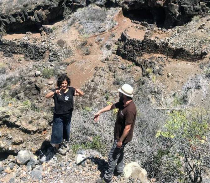 En primer lugar, se desplazaron hasta la zona de la Montaña de Los Riberoles (Bellido, Tinizara) donde se localiza un conjunto arqueológico de enorme interés, formado por grabados rupestres, canalillos y cazoletas, en medio de un paisaje vinícola espectacular y desde el cual se domina una vista realmente impresionante de todo el municipio, así como la costa oeste de La Palma.