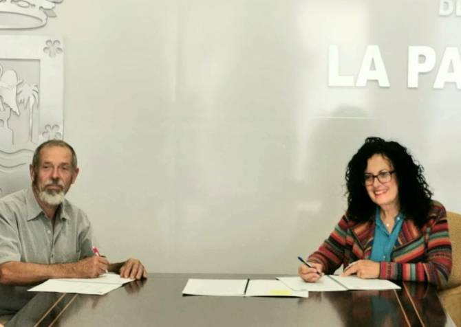 La consejera de Servicios y Cambio Climático del Cabildo, Nieves Rosa Arroyo, y el presidente de ADER La Palma, Luis Vicente Martín de Paz, han firmado el convenio de colaboración para la puesta en marcha y desarrollo del proyecto La Palma Orgánica, consistente en la gestión descentralizada de los residuos orgánicos a través del compostaje doméstico y comunitario.