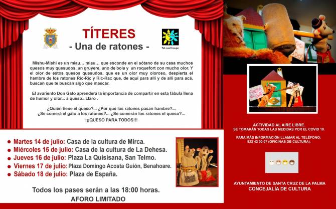 La Concejalía de Cultura del Ayuntamiento de Santa Cruz de La Palma ha organizado una representación de títeres con hasta cinco funciones que tendrán lugar en diferentes puntos del municipio, con el objeto de llegar al mayor número de espectadores posibles respetando todas y cada una de las recomendaciones de las Autoridades Sanitarias por el coronavirus Covid-19.