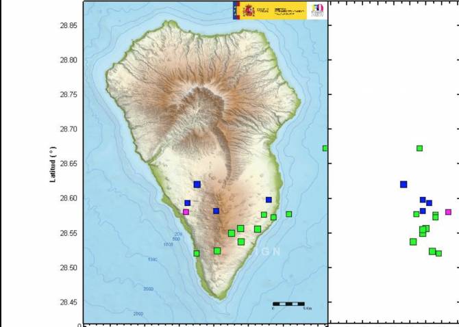 | Desde las 15:59 (UTC) del día de ayer, 24 de julio, hasta el momento de emitirse esta nota, se han localizado 16 terremotos en la región sur de la isla de La Palma. A las 18:12 (UTC) del día de hoy, y en un breve periodo de tiempo de unos 50 minutos, se ha registrado una secuencia de 10 terremotos localizados en la zona. En los registros de las estaciones más próximas, se aprecia una abundante actividad microsísmica. Toda la actividad se encuentra comprendida entre magnitudes 1,7-2,5 mbLg y a una profundidad alrededor de los 30 km. |