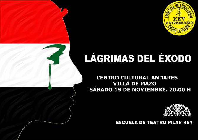Este sábado se podrá disfrutar en Villa de Mazo de la obra Lágrimas del éxodo, un montaje de la Escuela Municipal de Teatro de Santa Cruz de La Palma que invita a reflexionar sobre el drama de la inmigración, partiendo de textos de autores como Borja Ortiz de Gondra, Irma Correa, Antonio Tabares y Carlos Alonso, con dramaturgia de Carlos De León, director de la Escuela de Teatro. Cerca de una treintena de jóvenes y adultos de distintas edades participan en esta puesta en escena, que cuenta con la ambientación musical en vivo del percusionista Pepe Toni Tamarit.