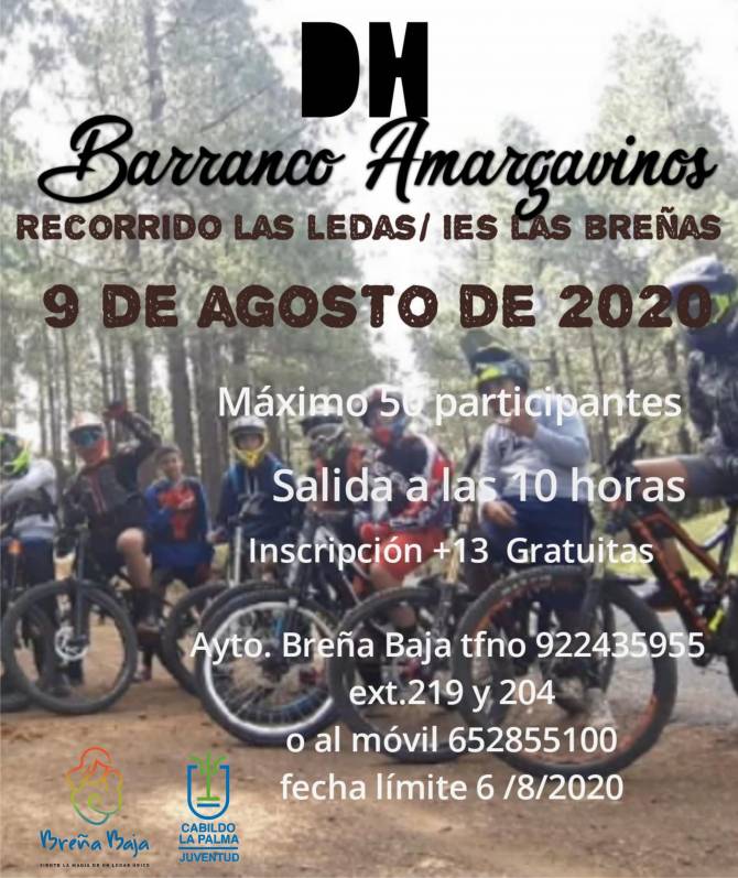 Las Concejalías de Juventud y Deportes del Ayuntamiento de Breña Baja organizan un Descenso de Mountain Bike por el Barranco de Amargavinos para el domingo 9 de Agosto a partir de las 10 hs, con la colaboración de un grupo de jóvenes aficionados a esta modalidad deportiva. Actividad gratuita y plazas limitadas.