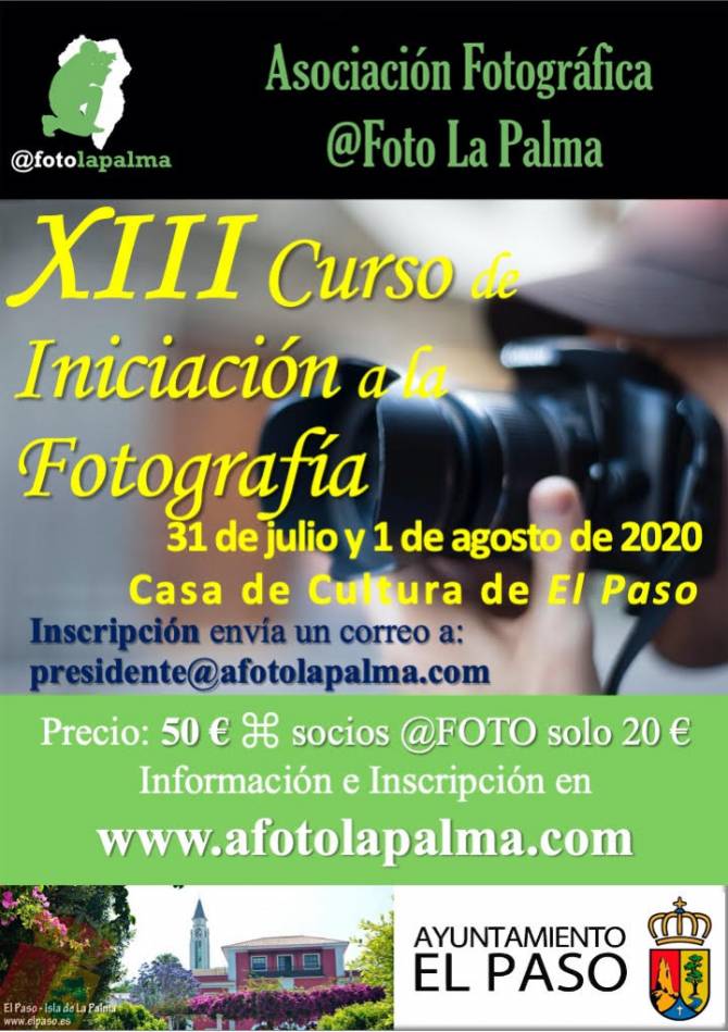 Las jornadas se celebrarán en la Casa de la Cultura de El Paso, tanto el viernes 31 de julio, de 18:00h a 21:00h, como el sábado 1 de agosto de 9:00h a 20:00h (con almuerzo incluido en el precio del curso). Se dirige a todas aquellas personas que quieran iniciarse en la fotografía de una manera rigurosa, práctica y amena, sacándole partido a su cámara digital. También es recomendable para aquellos aficionados que quieran reforzar sus conocimientos y habilidades.