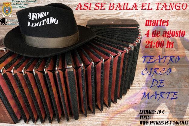 El tango es la magia de parejas entrelazadas, capaces de contar historias a través de sus movimientos. Es un arte que encuentra sus señas de identidad en el Río de la Plata, aunque extiende sus raíces por todo el planeta. La Concejalía de Cultura de Santa Cruz de La Palma es consciente de ese poder de atracción, de la fuerza que desprende, por lo que ha organizado para este martes, día 4 de agosto, el estreno de un espectáculo donde brilla la caminata tanguera, el corte y la quebrada con el Teatro Circo de Marte como escenario.