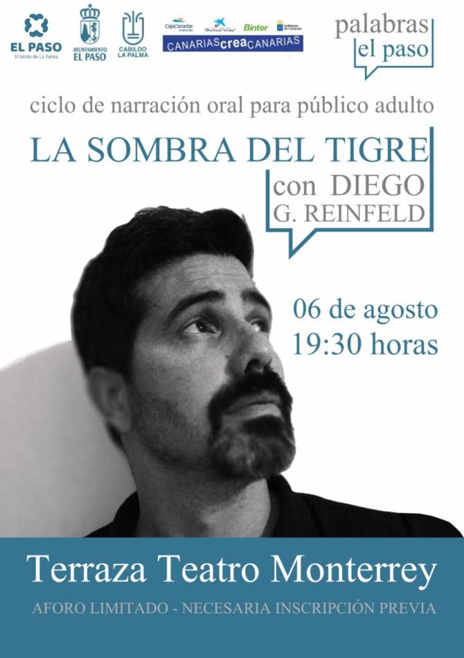 El Ayuntamiento pasense retoma la programación cultural presencial del Ciclo de Narración Oral para Público Adulto, ‘Palabras El Paso’, con el espectáculo La Sombra del Tigre, con Diego G. Reinfeld. La sesión tendrá lugar el próximo jueves 6 de agosto a las 19:30h en la terraza del Teatro Monterrey, con entrada libre hasta completar aforo.