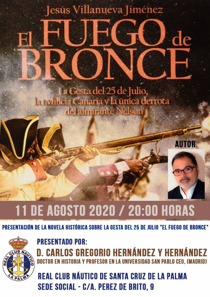 El próximo 11 de Agosto a las 20.00 horas en la Sede Social del Real Club Náutico de La Palma tendrá lugar la presentación de la novela histórica “EL FUEGO DE BRONCE” en la que su autor, Jesús Villanueva Jiménez, logra plasmar la gesta allá por el 25 de Julio de 1797 en la que el legendario almirante inglés Horacio Nelson perdió un brazo en la única derrota de su carrera: la fallida invasión de Santa Cruz de Tenerife, puente para conquistar las Islas Canarias y convertirlas en un nuevo Gibraltar.