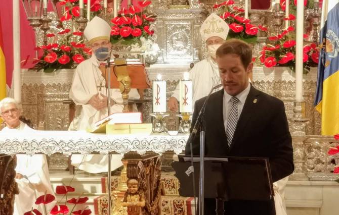 El presidente, Mariano H. Zapata, entregó su bastón de mando y la bandera de la isla a la imagen mariana en su Real Santuario