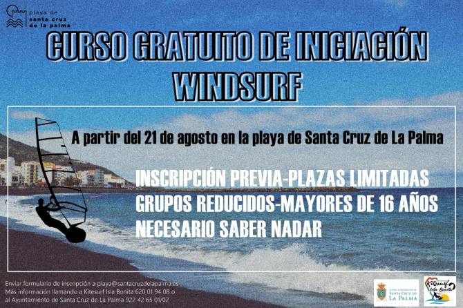 El Ayuntamiento de Santa Cruz de La Palma pondrá en marcha a partir del día 23 de agosto un curso gratuito de iniciación al windsurf para grupos reducidos de tres alumnos, actividad que se desarrollará en una zona delimitada de la playa de la capital.