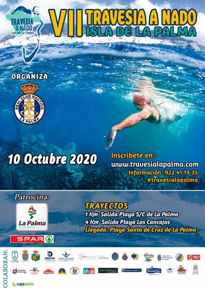 La VII edición de la TRAVESÍA A NADO ISLA DE LA PALMA ya tiene nueva fecha en el calendario. Se celebrará el sábado 10 DE OCTUBRE DE 2020 en aguas abiertas de la Isla de La Palma. Evento deportivo organizado por el REAL NUEVO CLUB NÁUTICO DE SANTA CRUZ DE LA PALMA con el patrocinio del Área de Turismo del Excmo. Cabildo Insular de La Palma y Spar La Palma, en colaboración con el Área de Deportes dela institución insular, y de los ayuntamientos implicados en cada uno de sus trayectos, siendo en esta ocasión los municipios de Breña Baja (Trayecto 4km) y Santa Cruz de La Palma (Trayecto 1 km). Asimismo se contará con la colaboración de diversos organismos públicos y privados que apuestan por el deporte.