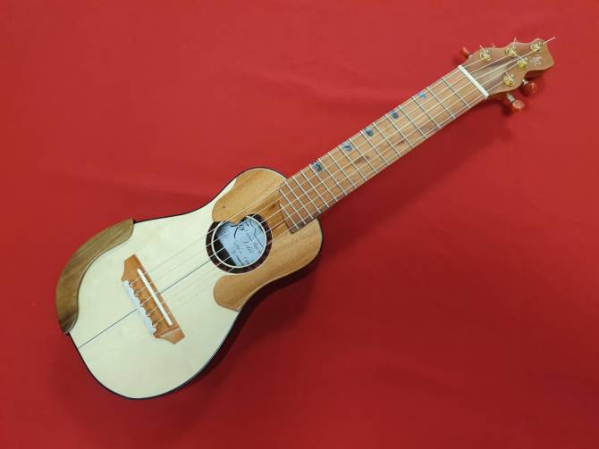 Tanto el fondo como los aros están elaborados con palosanto de India, mientras que la tapa es de abeto italiano. El mástil está fabricado con cedro real de Honduras. El diapasón, la pala y el golpeador son de eucalipto rojo y la rampa o apoya brazo de tilo. Además, cuenta con clavijero de precisión.